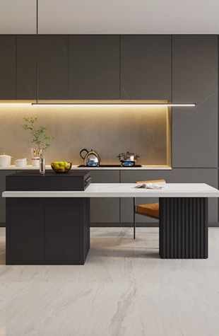 橱柜踢脚线通常采用铝合金、不锈钢板材等,常规厚度为 0.6-1.2mm, 宽 度 为 60-100mm。